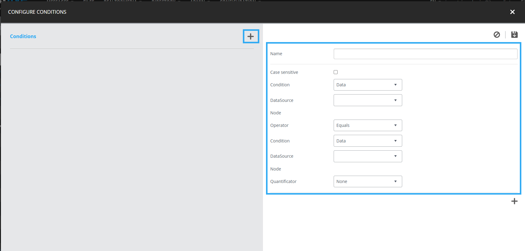In the new condition window, click “+” to add a new condition.